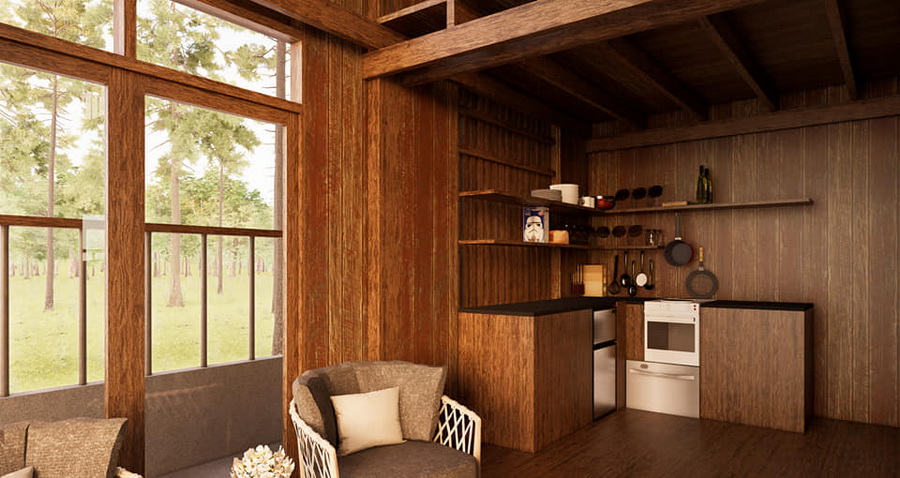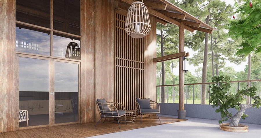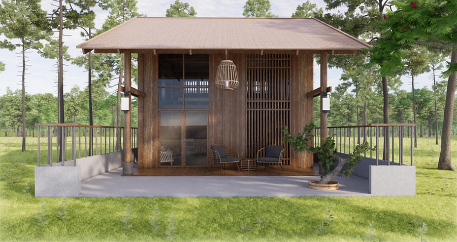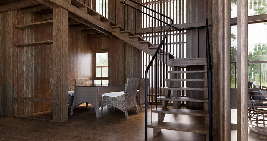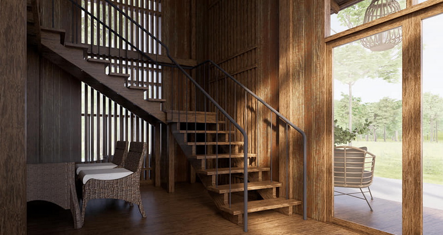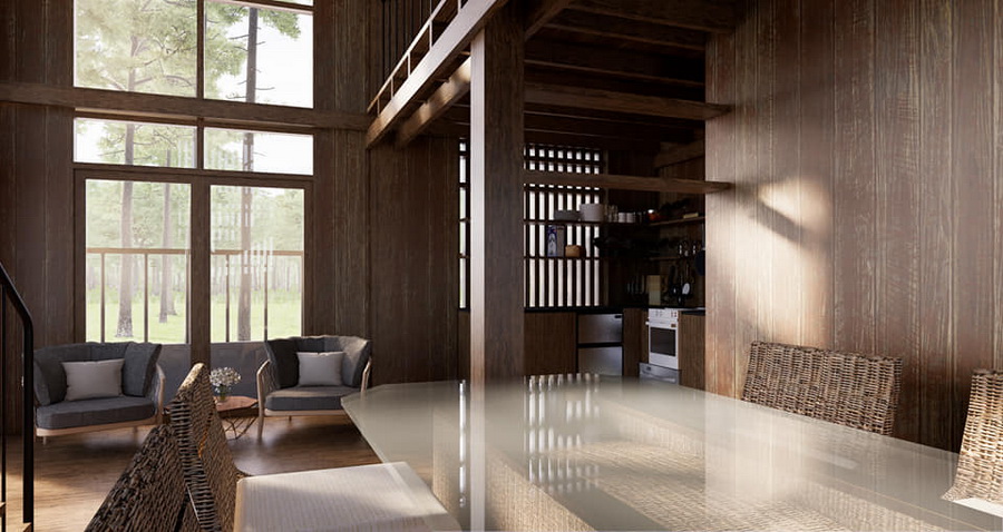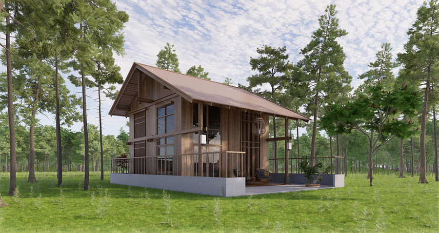 บ้านหลังนี้เป็นบ้านขนาดชั้นครึ่ง ตัวบ้านออกแบบเพดานยกสูง โครงสร้างของตัวบ้านเป้นงานไม้ทั้งหมด จึงให้กลิ่นอายแบบรัสติกอย่างชัดเจน ทำให้ได้บรรยากาศที่อบอุ่นน่าพักผ่อน หลังคาของบ้านเป็นหลังคาทรงหน้าจั่วที่เข้ากันได้ดีกับตัวบ้าน เป็นบ้านที่เหมาะกับการพักผ่อนแบบตากอากาศโดยเฉพาะ
