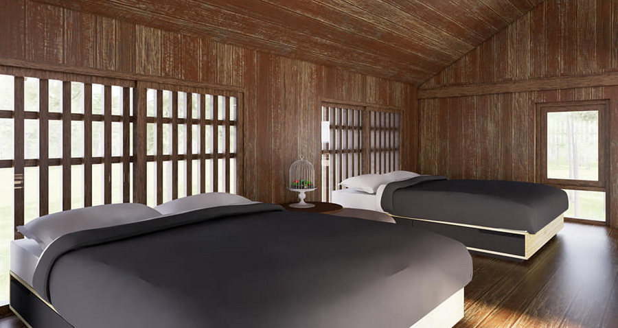 สำหรับห้องนอนนั้น เป็นห้องที่ตั้งอยู่บนพื้นที่ชั้นลอฟท์ โดยเป็นแบบเตียงคู้ที่มีผนังห้องแบบเปิดโล่ง ทำให้เหมาะกับการพักตากอากาศแบบครอบครัว