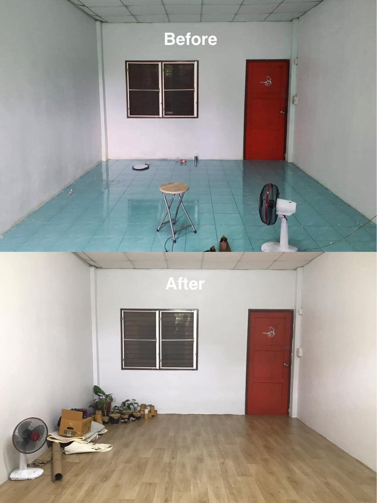 เสื่อที่ใช้จะเป็นเสื่อน้ำมันลายไม้ขนาด 0.8 มิลลิเมตร สามารถนำมาปูพื้นได้เองแบบง่าย ๆ เลย จากรูปเราจะเห็นได้ว่าบรรยากาศและโทนของห้องเปลี่ยนไปอย่างชัดเจน