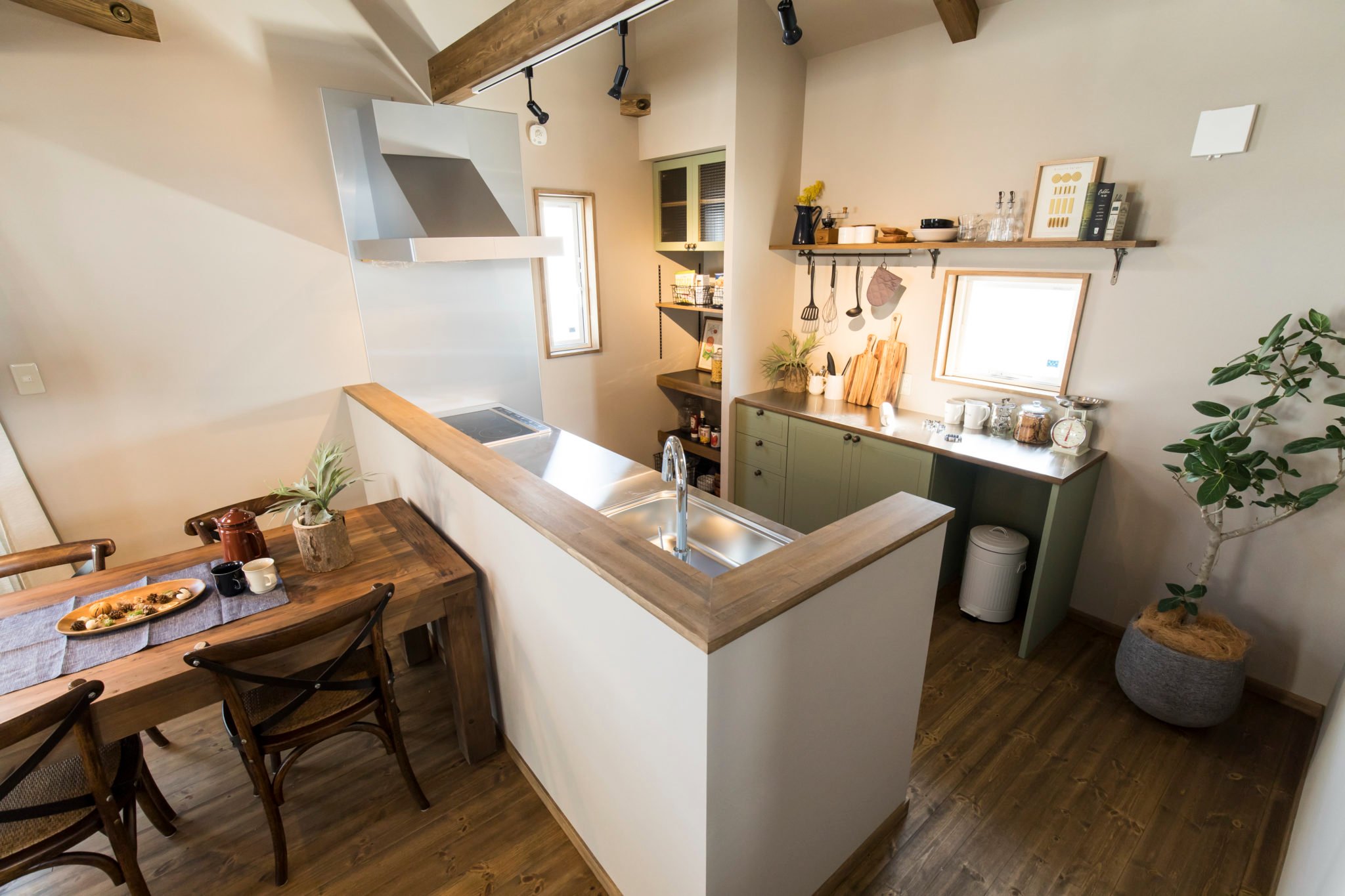 ภายในห้องครัว จะมีองค์ประกอบต่าง ๆ ที่ให้ความเป็นโมเดิร์น แต่ในงานวัสดุก็ยังคงเป็นงานไม้ที่ให้โทนสีและบรรยากาศที่อบอุ่น เช่นเดียวกันกับส่วนอื่น ๆ ของบ้าน