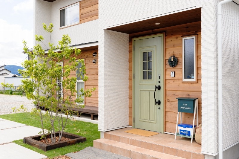 ที่ส่วนของประตูเข้าบ้าน จะมีกลิ่นอายแบบยุโรป ซึ่งสะท้อนผ่านงานดีไซน์ของบานประตูแบบมีช่องหน้าต่าง รวมไปถึงราวจับที่มีเอกลักษณ์เฉพาะตัว