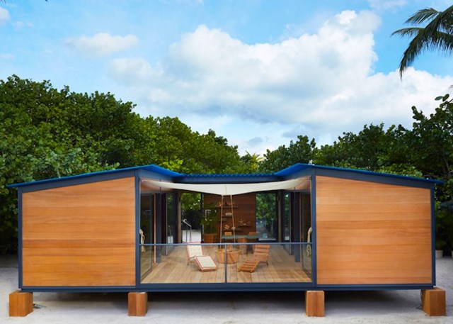 บ้านโครงสร้างเหล็ก ที่ออกแบบรูปทรงกล่อง เว้นพื้นที่กลางบ้านทำเป็นเฉลียง ยกพื้นพอดีๆ ตกแต่งด้วยไม้สวยงาม จับคู่กับหลังคาเพิงหมาแหงน ดูทันสมัย รับเข้ากับแบบบ้านตามชายหาด