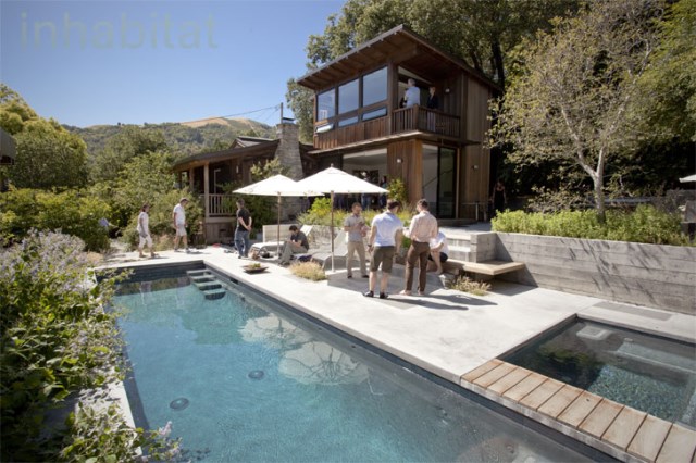 บ้านโครงสร้างเหล็ก ตกแต่งด้วยไม้ ในรูปทรงกล่องของตัวบ้าน มีช่องแสงกระจกจำนวนมาก เน้นเปิดมุมมองไปยังสระว่ายน้ำ และนำแสงเข้ามาช่วยแก่ภายใน หลังคาเพิงหมาแหงนดูเรียบง่ายที่สุด