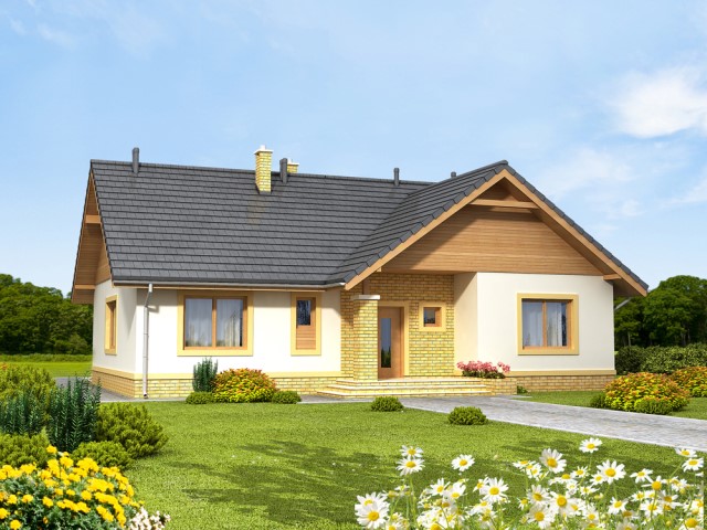 บ้านโครงสร้างคอนกรีต ที่ออกแบบตัวบ้านเรียบง่าย ใช้หลังคาทรงจั่วโทนสีเทา หักมุมตามตัวบ้าน ตกแต่งหน้าบันหลังคาด้วยไม้ และกรอบประตู หน้าต่างไม้เช่นกัน ดูเป็นวัสดุที่คุ้นตา และเป็นที่นิยมของคนไทยไม่น้อย