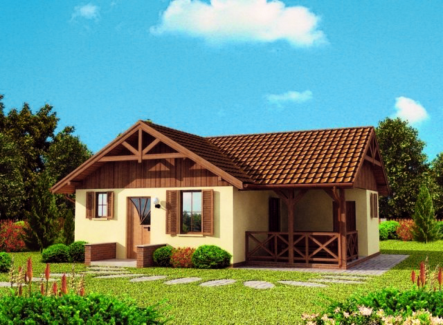 บ้านโครงสร้างคอนกรีต ที่ออกแบบตัวบ้านเรียบง่าย ใช้หลังคาทรงจั่วสีแดงสด หักมุมตามตัวบ้าน ตกแต่งหน้าบันหลังคาด้วยไม้ และเสา ราวระเบียงไม้เช่นกัน ดูเป็นวัสดุที่คุ้นตา และเป็นที่นิยมของคนไทยไม่น้อย