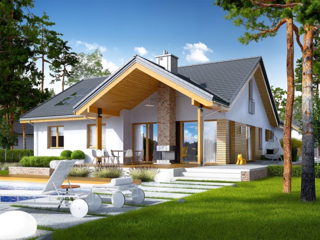 บ้านร่วมสมัยหลังคาทรงจั่ว วัสดุตกแต่งจากไม้ กลิ่นอายแบบบ้านคลาสสิค สวยงามและภูมิฐาน พร้อมสระว่ายน้ำขนาดเล็ก