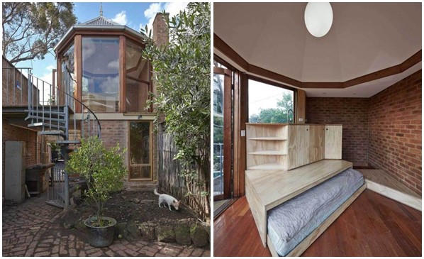 ด้วยมีเนื้อที่ที่จำกัด จึงดีไซน์ตัวบ้านขึ้นที่สูง แบบบ้านสองชั้น สะดุดตาไปกับบันไดวนที่บ้านบ้าน ใช้โครงสร้างเหล็กจากการรับน้ำหนัก พาดเข้ากับแนวรั้วข้างเคียง ที่ดีไซน์ให้เข้ากันได้ดีด้วยอิฐโชว์แนว ให้อารมณ์เก่าๆ