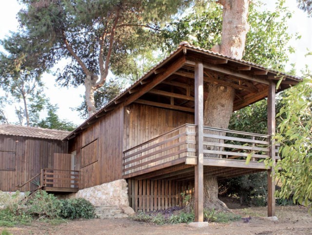 ใช้โครงสร้างไม้ ที่ออกแบบรูปทรงเรียบง่ายที่สุด ดีไซน์ให้บ้านนั้น อยู่คร่อมทับต้นไม้ใหญ่ เจาะหลังคาให้ต้นไม้ได้ทะลุผ่าน ใสพร้อมหลังคาเพิงหมาแหงน และเฉลียงขนาดกำลังดี