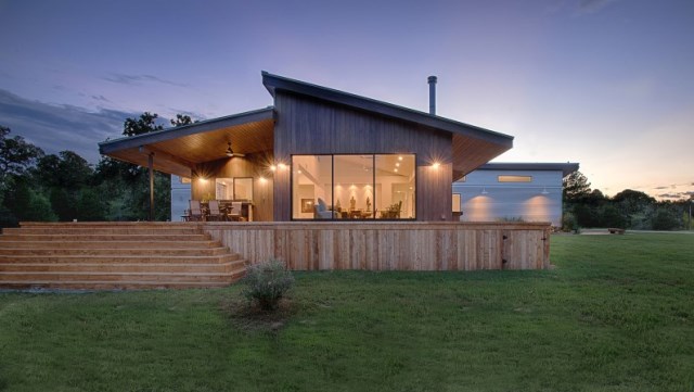 บ้านไม้หลังคาปีกนก ตกแต่งด้วยไม้สไตล์ทันสมัย ยกพื้นสูงและเฉลียงรอบบ้าน