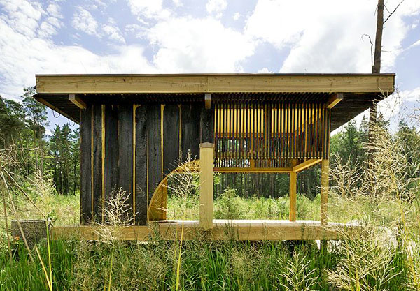 ตัวบ้านใช้โครงสร้างไม้ทั้งหลัง รูปทรงเรียบง่าย และใช้หลังคาทรงเพิงฯ ลาดเอียงเล็กน้อย ออกแบบด้วยไม้สีทูโทน ดำ-น้ำตาล เปิดผนังให้โล่ง ดูโปร่งเบา น่าอยู่