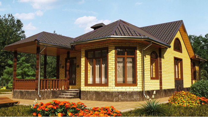 ลักษณะบ้านขนาดชั้นเดียว ตัวบ้านยกพื้นต่ำ ตัวฐานเป็นคอนกรีตที่ตกแต่งด้วยลวดลายธรรมชาติ ผนังภายนอกออกแบบการตกแต่งด้วยอิฐในโทนสีเหลืองอ่อน ผสานการตกแต่งขอบประตู หน้าต่าง และส่วนอื่นๆ ในโทนสีน้ำตาล จึงให้บรรยากาศที่อบอุ่น ทางเข้าหน้าบ้านออกแบบด้วยซุ้มประตูแบบโค้งสไตล์ยุโรป