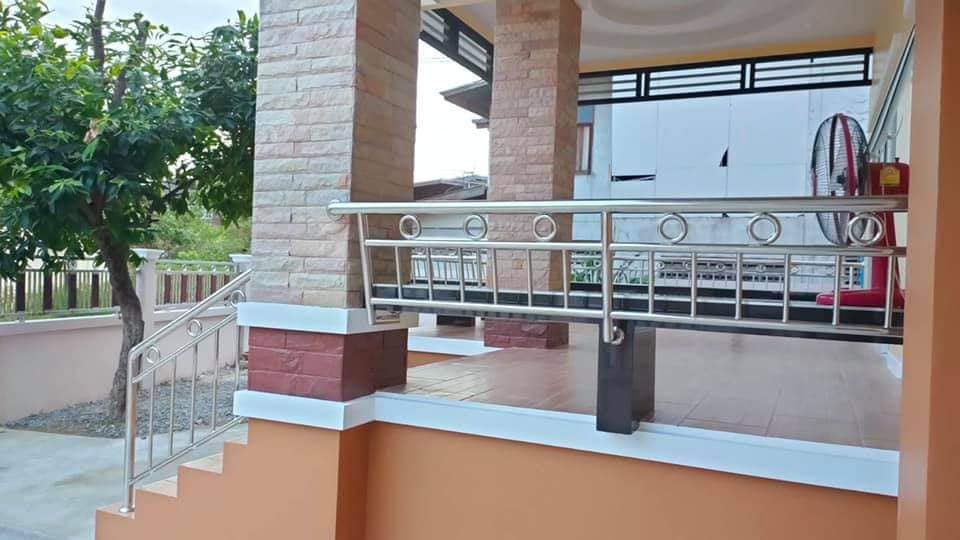 นอกจากนี้ทางเข้าหน้าบ้านก็เป็นเฉลียงเปิดโล่ง มาพร้อมม้านั่งยาวแบบมีผนักพิง จึงเหมาะกับการเป็นพื้นที่เพื่อการนั่งเล่นโดยเฉพาะ