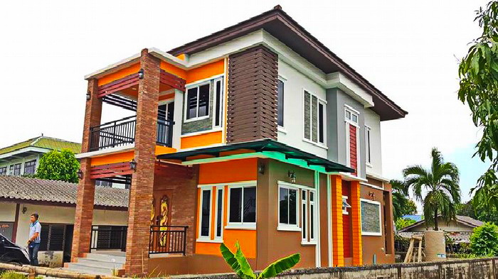 ลักษณะบ้านขนาดสองชั้น ออกแบบด้วยรูปทรงเรขาคณิต ในแบบฉบับสไตล์โมเดิร์น การตกแต่งเน้นรายละเอียดที่หลากหลายและสวยงาม ผนังภายนอก ในส่วของชั้นล่างตกแต่งด้วยโทนสีน้ำตาล ผนังและเสาด้านหน้าตกแต่งด้วยกระเบื้องลายอิฐ ชั้นบนตกแต่งด้วยโทนสีขาวและเทา ทั้งสองชั้นแซมด้วยโทนสีเหลืองสดใส ช่วยสร้างบรรยากาศที่สนุกสนาน