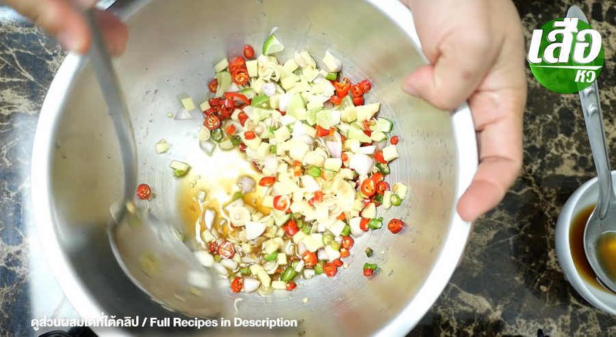 เมื่อได้รสชาติที่เราชื่นชอบแล้ว ทำการใส่ ตะไคร้ซอย ตามด้วย หอมแดงซอย ขิงซอย และมะนาว ที่เราหั่นเป็นชิ้นลูกเต๋า คลุกส่วนผสมทั้งหมด ให้เข้ากัน และตามด้วย ใบสาระแหน่ เท่านี้ ก็เสร็จเรียบร้อยแล้ว